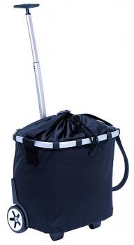Carrycruiser noir par Reisenthel. Sac de courses sur roulette avec barre télescopique. Très pratique il s'accroche aussi à votre chariot par 2 clips. Caractéristiques:- grandes roues à roulements à billes- barre télescopique double escamotable- petite poche avec 2 supports à clips et 2 jetons pour le caddie.- doublure intérieurs amovible, lavable- charge maximale : 15 kg Dimensions : 42 * 48 * 32 cm; volume : 40L